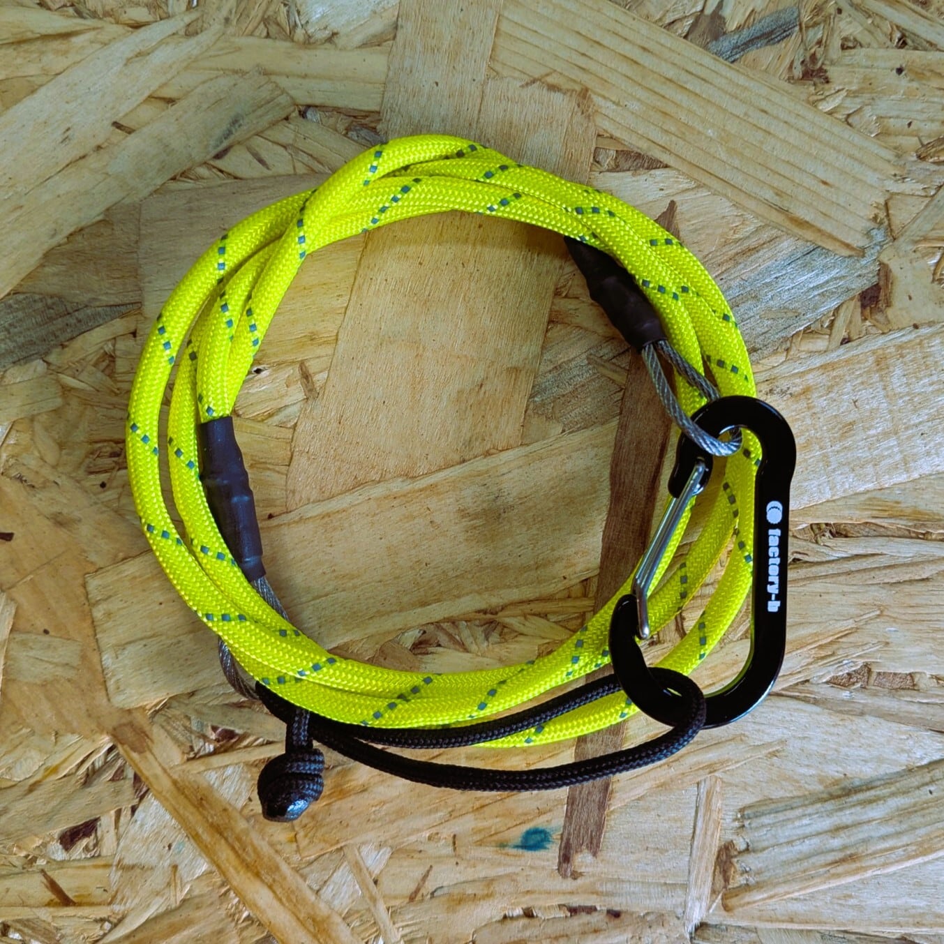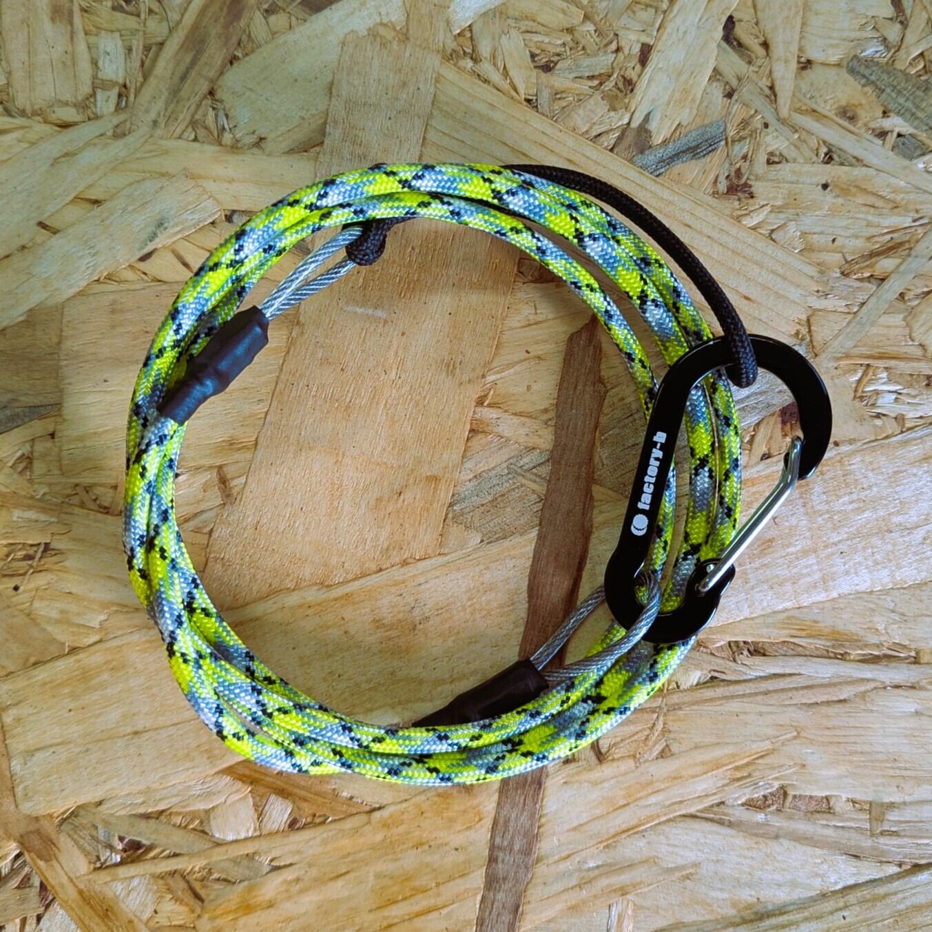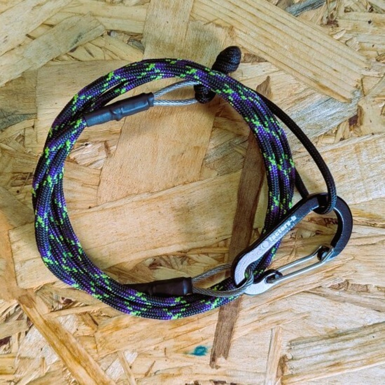 ステンレスワイヤーの芯に、耐摩耗性の高いパラコードを被せたタフ仕様のリーシュコード。コードに張があるので絡みにくくストレスが少ないです。